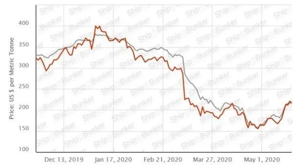 4  201912月中旬至20205月上旬期間,新加坡燃料油IFO380價(jià)格(紅線)與北海布倫特原油價(jià)格(灰線)比較  來(lái)源Ship & Bunker