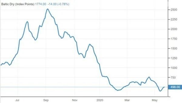 3  20197(Jul. )20205月(May. )期間,波羅的海干散貨指數(shù)(BDI)的變化 來(lái)源TradingEconomics.com