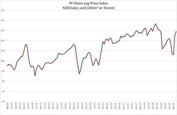 由于原木出口價(jià)格的上漲,自20203月起,PF奧爾森原木價(jià)格指數(shù)(PF Olsen Log Price Index)已經(jīng)上漲了23美元至126美元。自4月開(kāi)始,碼頭門(mén)價(jià)格(AWG prices)就沒(méi)有被提供,但自從重新開(kāi)始上線后,原木的供給就緊俏起來(lái)。